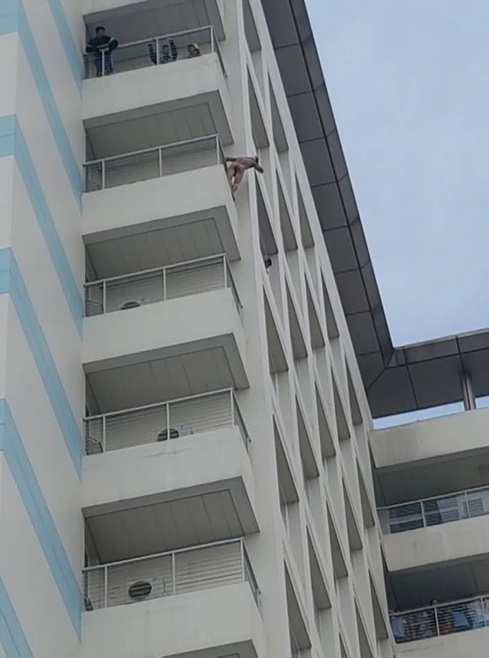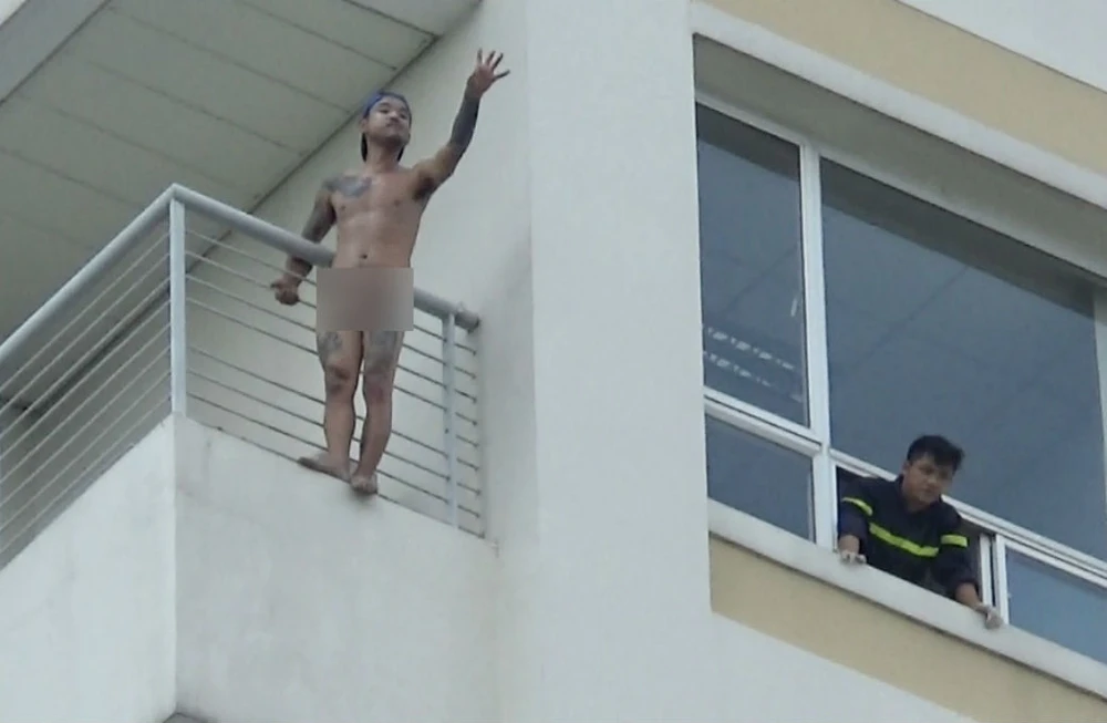 Nam thanh niên trong tình trạng khỏa thân đứng cheo leo ngoài lan can BV.