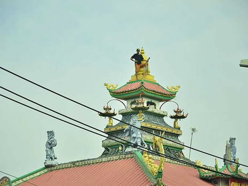 Thanh niên bị ngáo đá trèo lên nóc chùa ở quận 8 cố thủ. Ảnh: N.TÂN