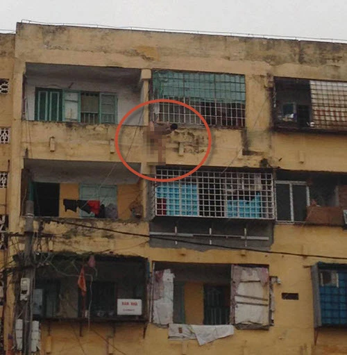Nam thanh niên đang làm “xiếc” ở tầng 5 khu tập thể 5 tầng, phường An Dương, Q. Lê Chân, TP. Hải Phòng.