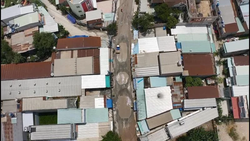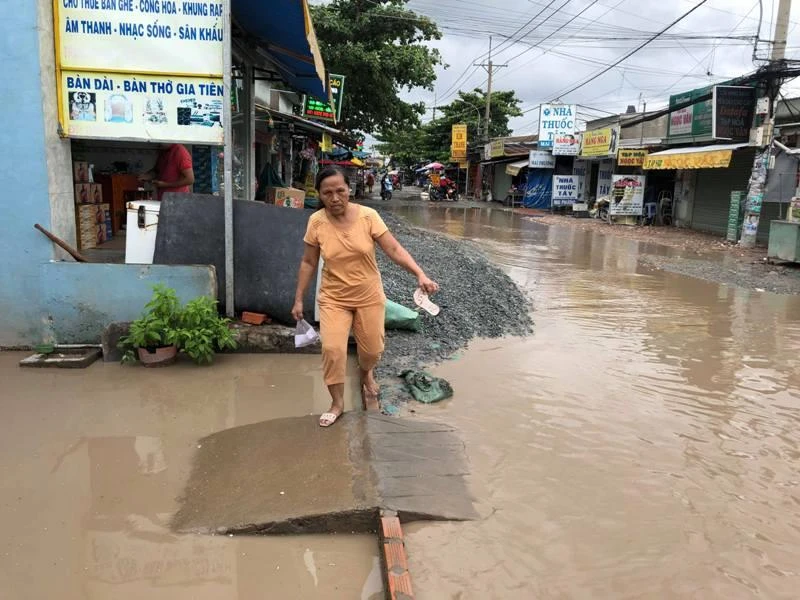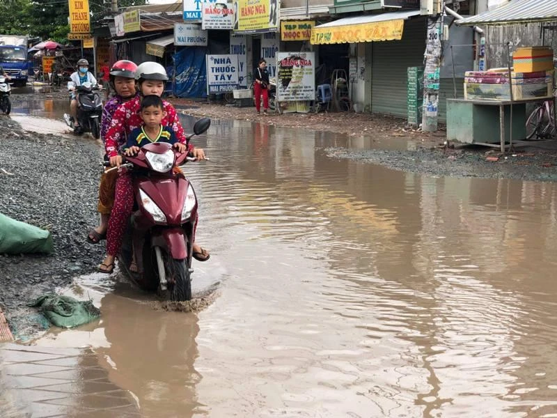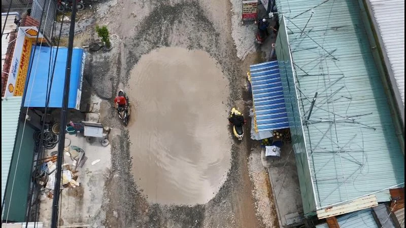 Trên mặt đường Nữ Dân Công, xã Phước Lộc A, huyện Bình Chánh, TP.HCM có đến gần 100 "hồ bơi" lớn nhỏ. Người dân nào di chuyển không chú ý hoặc không quen đường rất dễ bị té ngã.