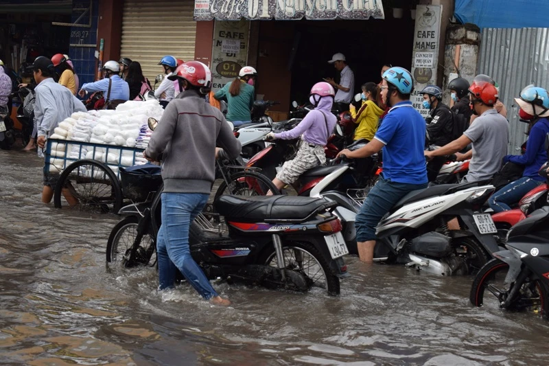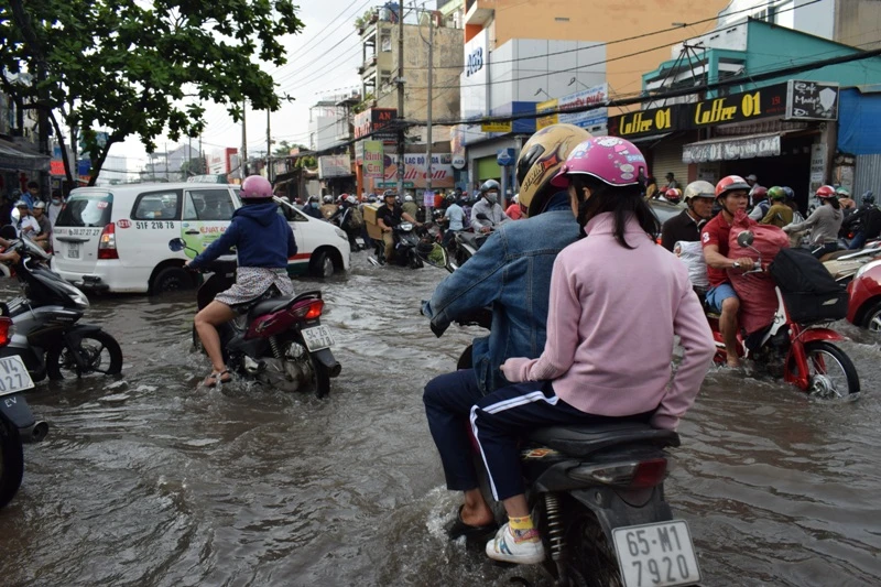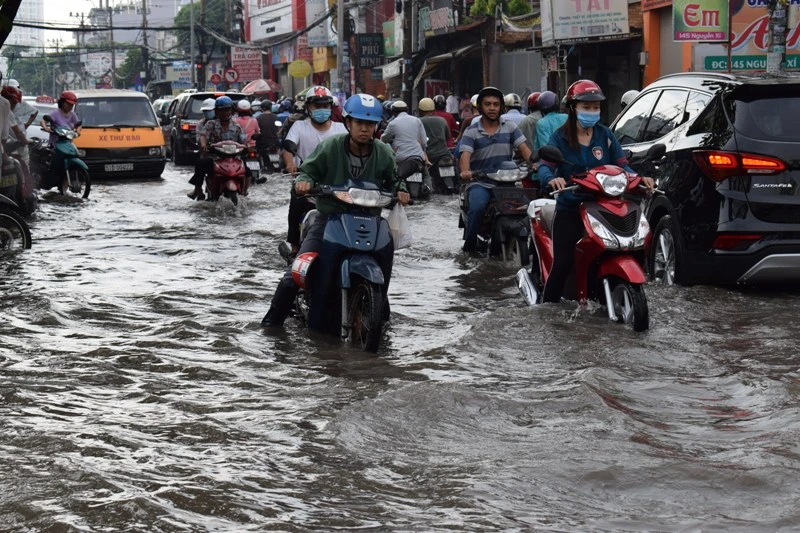 Cả tuyến đường Nguyễn Xí (phường 26, quận Bình Thạnh) như hóa sông sau trận mưa đêm qua.