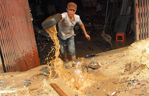 Công nhân một cơ sở cơ khí ở quận Thủ Đức tát nước mưa sau một đêm ngập. Ảnh: HTD