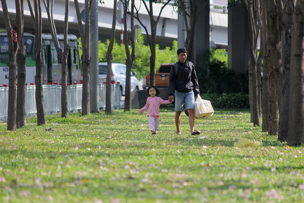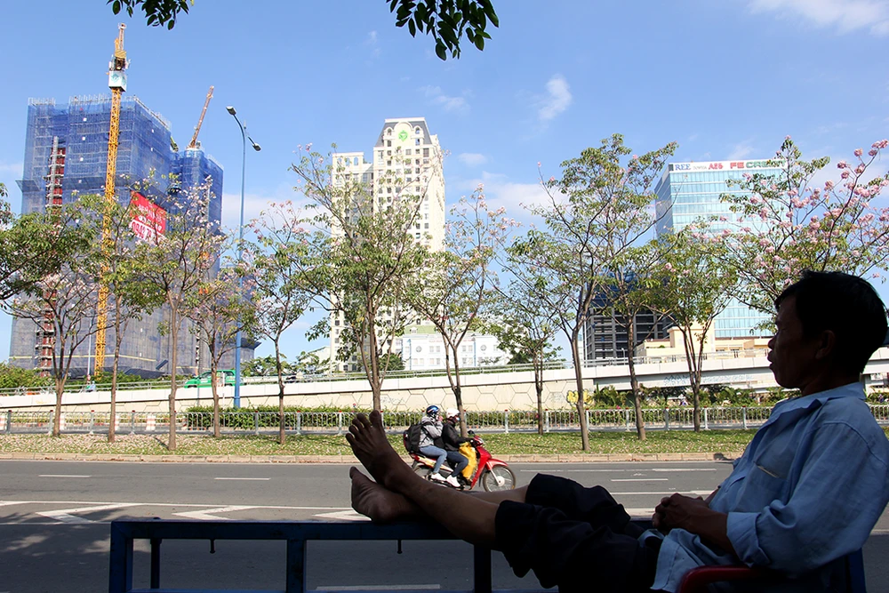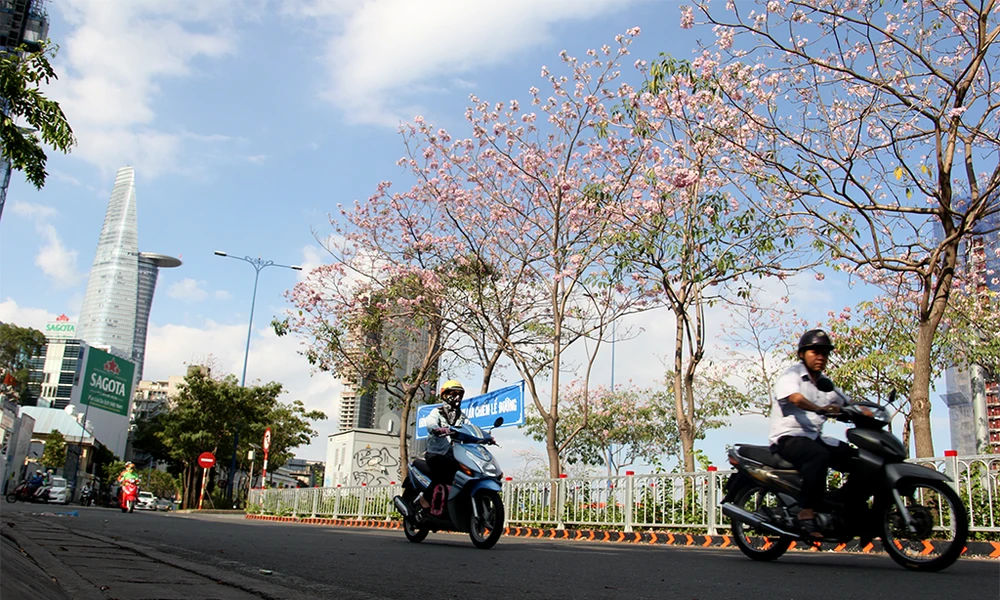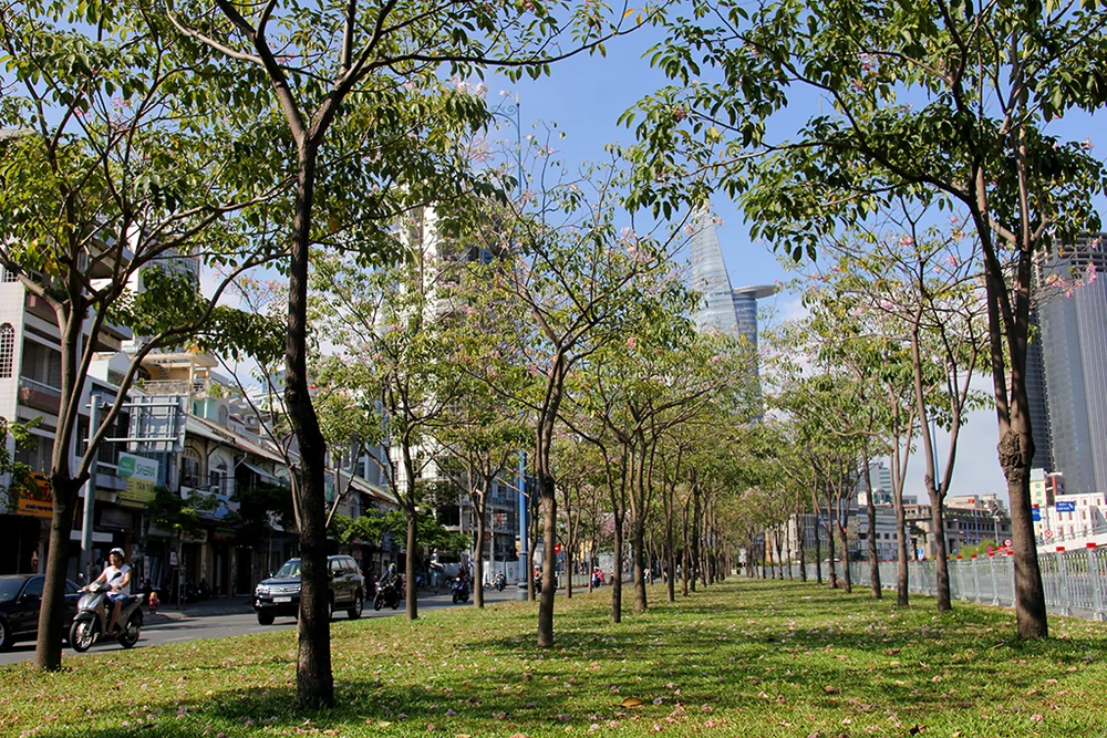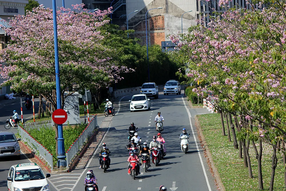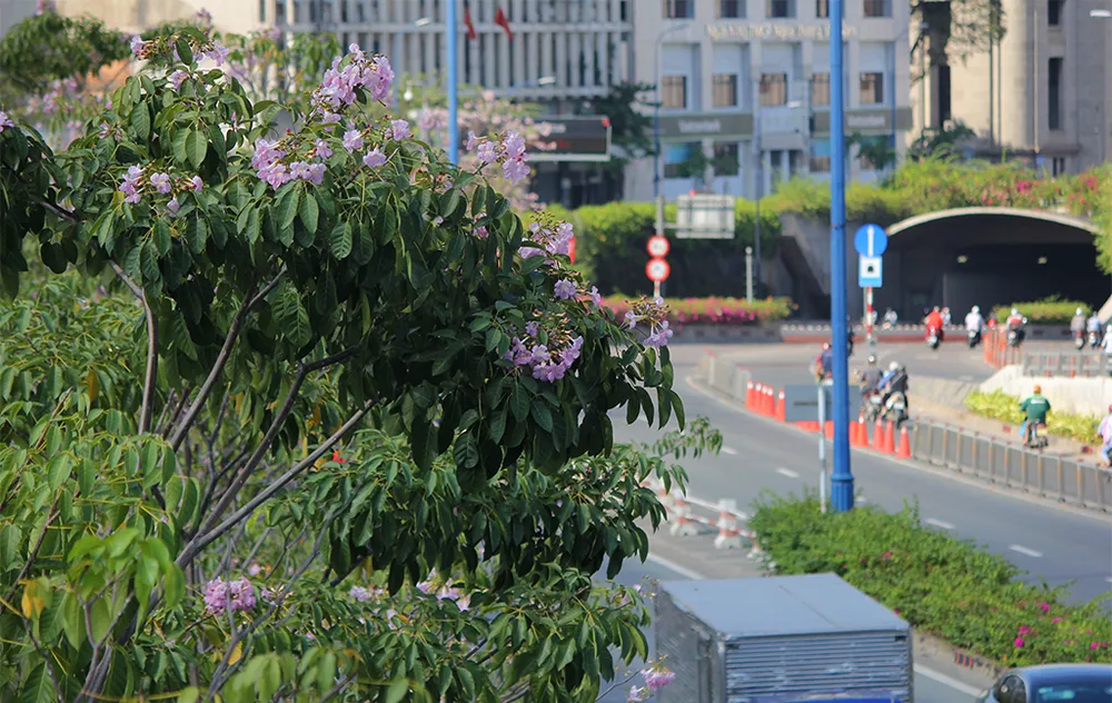 Vừa qua khỏi hầm Thủ Thiêm (hướng quận 2 sang quận 1), người đi đường không khỏi ngỡ ngàng khi lạc vào một cung đường lãng mạn, mát mẻ nhờ hàng cây hoa kèn hồng.