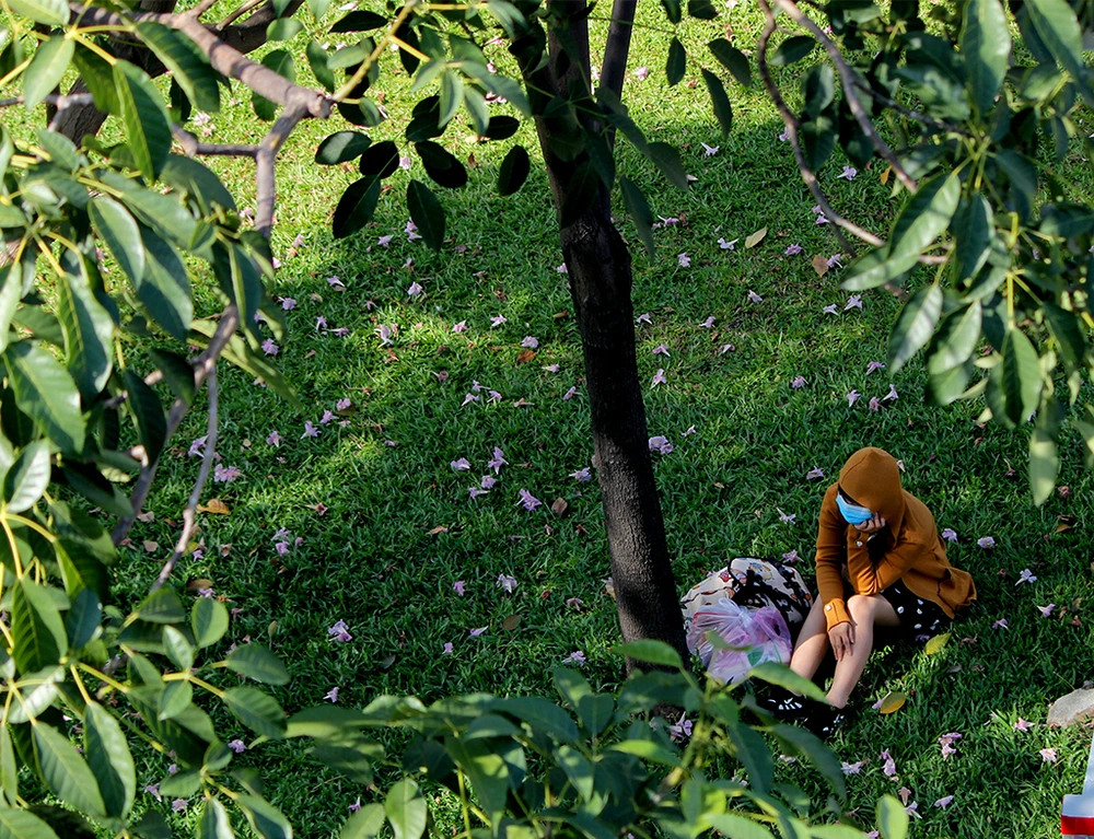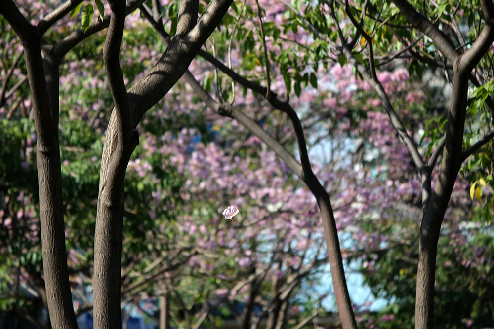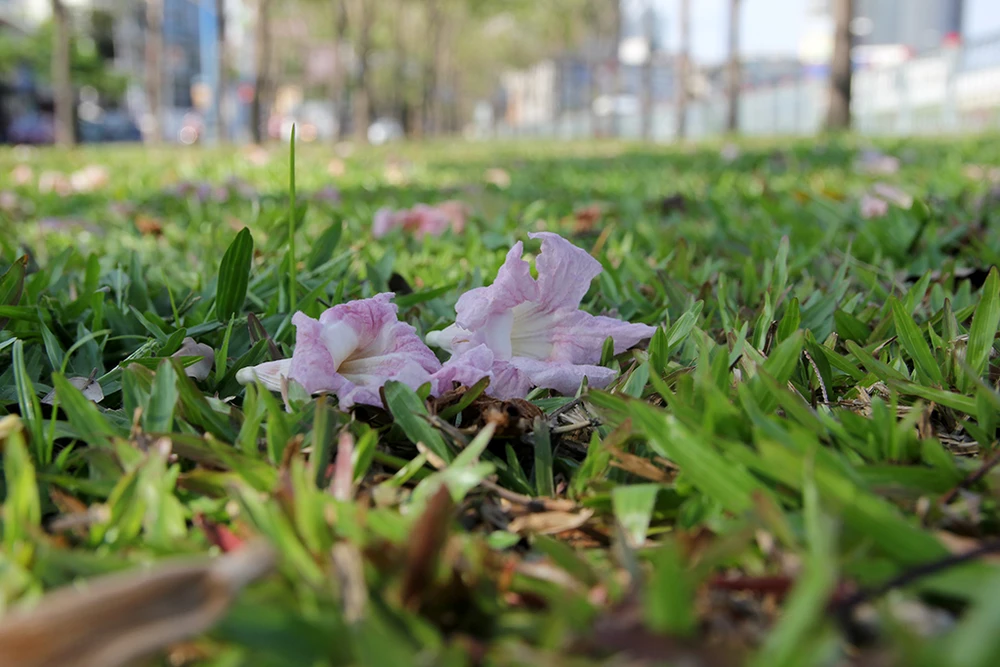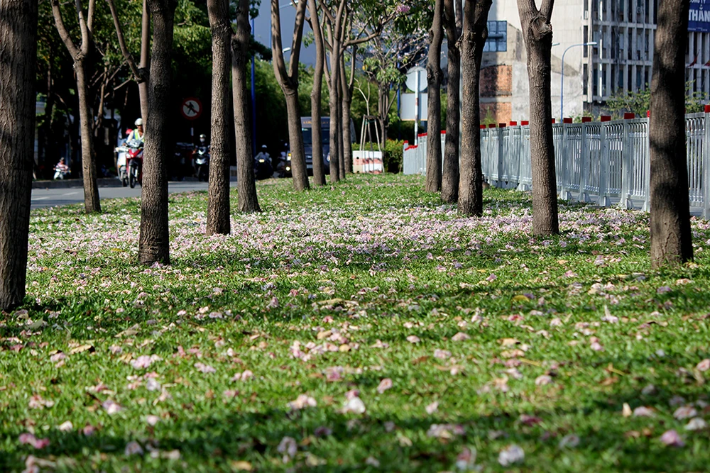 Dưới gốc cây đầy những xác hoa kèn hồng mỏng manh, tàn úa.