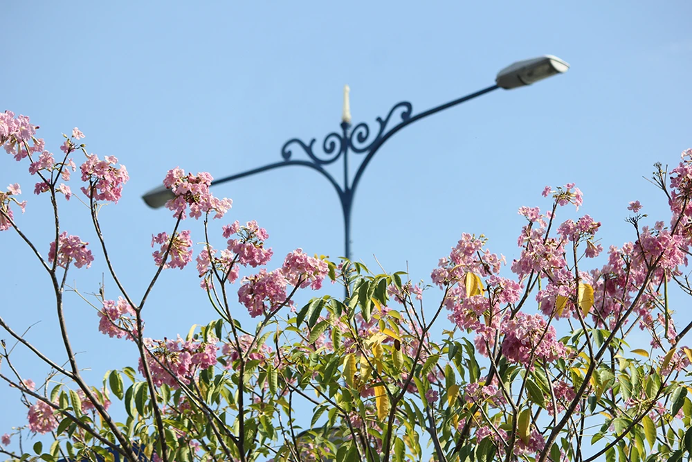 Dưới ánh nắng rực rỡ, màu hoa kèn hồng kết hợp với nền trời xanh ngắt như bức tranh khiến nhiều người ngắm nhìn.