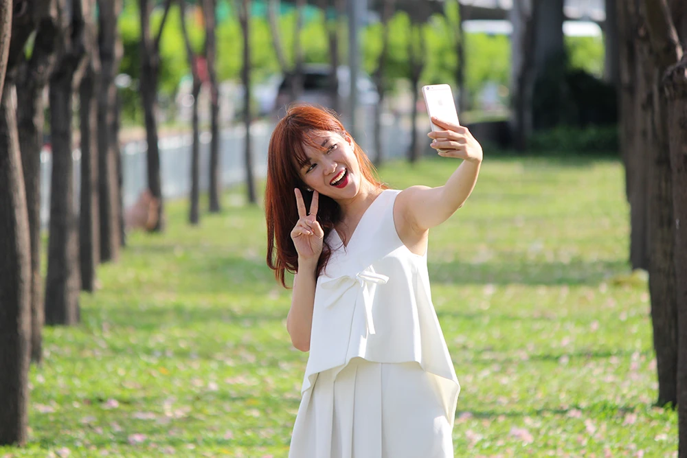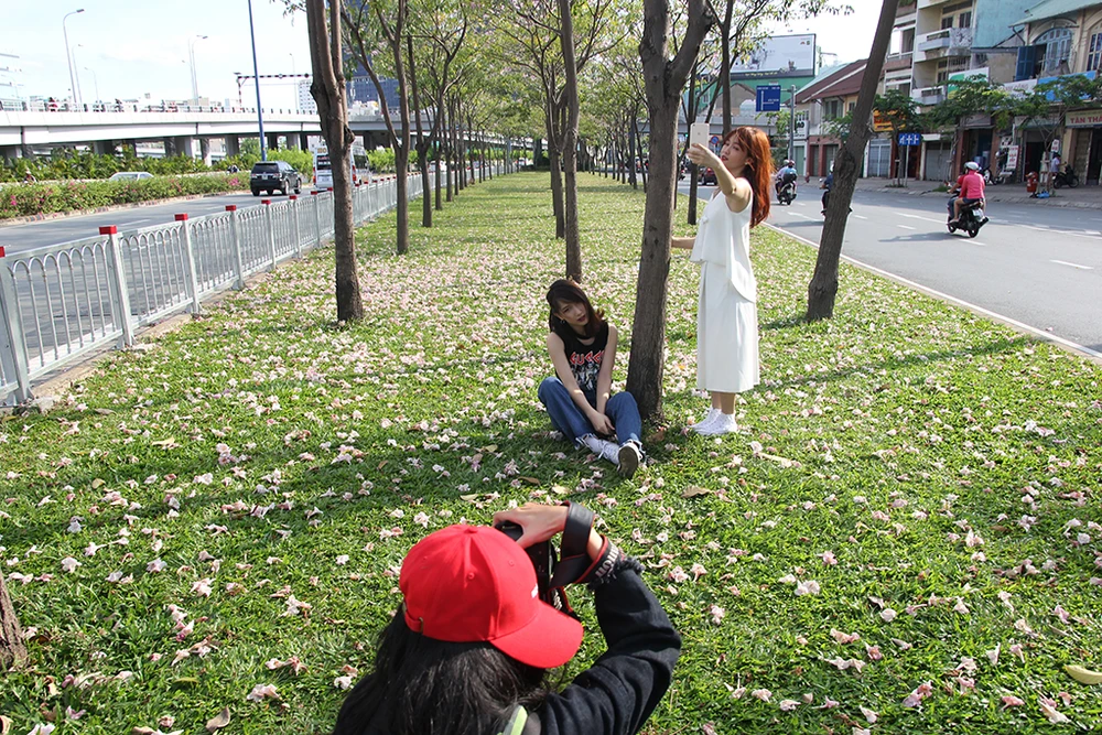 Nhóm bạn Quỳnh Thy trên đường đi ngang thấy hàng cây nở hoa đẹp nên tranh thủ ghi lại những tấm hình lưu niệm.