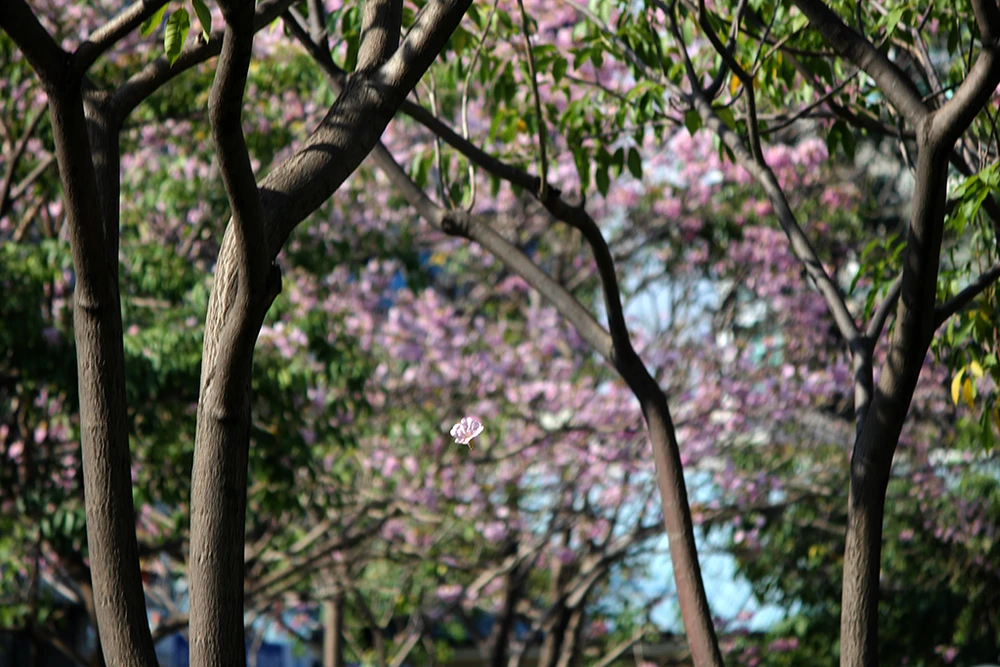 Mỗi đợt gió đi qua, kèn hồng lại rơi lác đác, chao nghiêng giữa không trung.