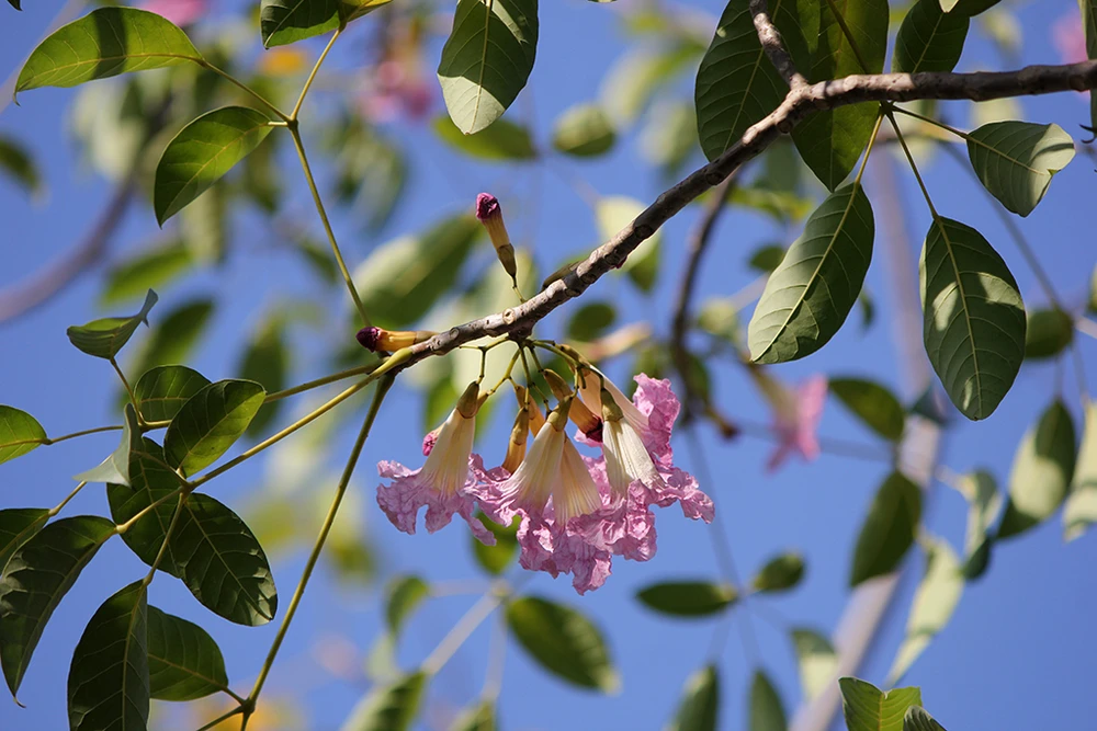 Từng chùm hoa kèn hồng đua nhau nở rộ trên mỗi cành cây.