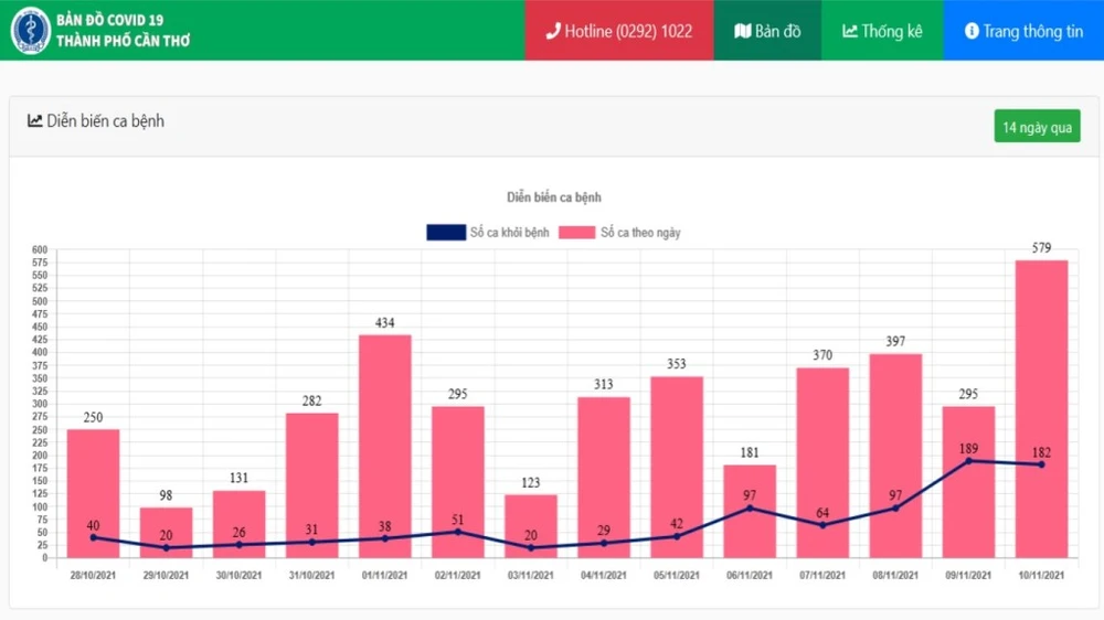 Hôm nay Cần Thơ lại lập "kỷ lục" về số F0 mới trong ngày với 579 ca. Ảnh: Cổng thông tin COVID-19 Cần Thơ.