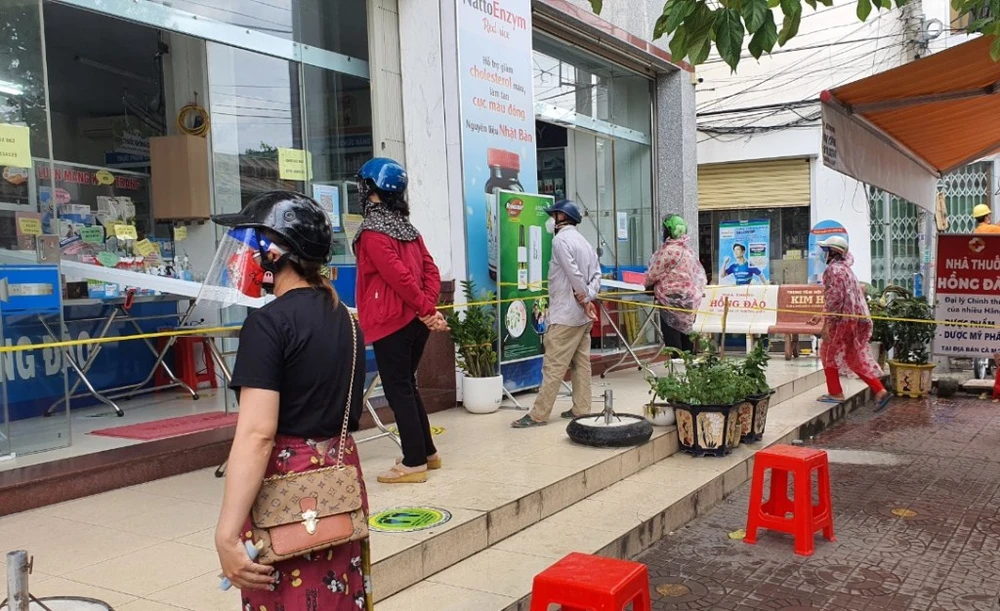 Người dân TP Cà Mau (tỉnh Cà Mau) xếp hàng giãn cách chờ mua thuốc tây. Ảnh: TRẦN VŨ