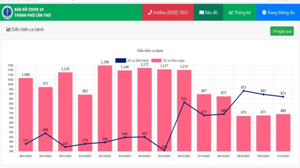 Thống kê trên bản đồ dịch COVID-19 TP Cần Thơ, ba ngày qua số ca nhiễm mới đều dưới 700 người, còn số ca điều trị khỏi thì cao hơn, từ 871 đến 933 người.