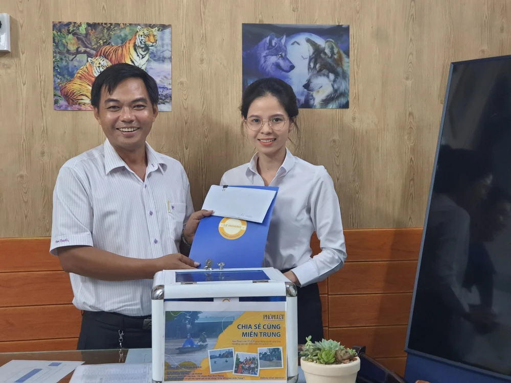 Đại diện Công ty Luật Lê Hoàng (phải) trao số tiền hỗ trợ đồng bào miền Trung cho đại diện Văn phòng báo Pháp Luật TP.HCM tại Cần Thơ