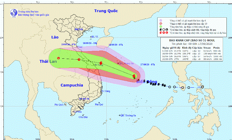 Đến 7 giờ sáng mai (18-9), tâm bão ở ngay trên vùng biển các tỉnh từ Quảng Bình - Quảng Ngãi với cường độ mạnh cấp 11-12, giật cấp 14. Sau đó, bão tiếp tục đi sâu vào đất liền các tỉnh từ Quảng Bình - Quảng Nam với tốc độ 25km/giờ. Sức gió mạnh nhất vùng gần tâm bão mạnh cấp 10-11, giật cấp 13.