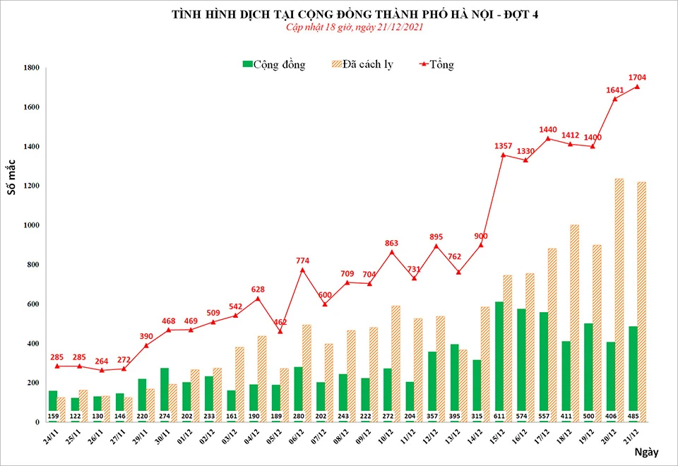 Theo đó, toàn TP ghi nhận 1.704 ca F0 mới, trong đó cộng đồng có 485 ca, khu cách ly là 1.140 ca, khu phong tỏa là 89 ca. Số ca này cao hơn so với mốc kỷ lục 1.641 ca F0 mới vừa được ghi nhận trước đó 24 giờ (ngày 20-12).