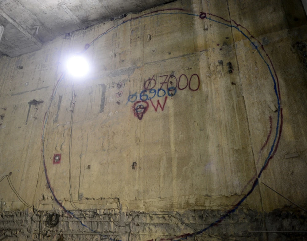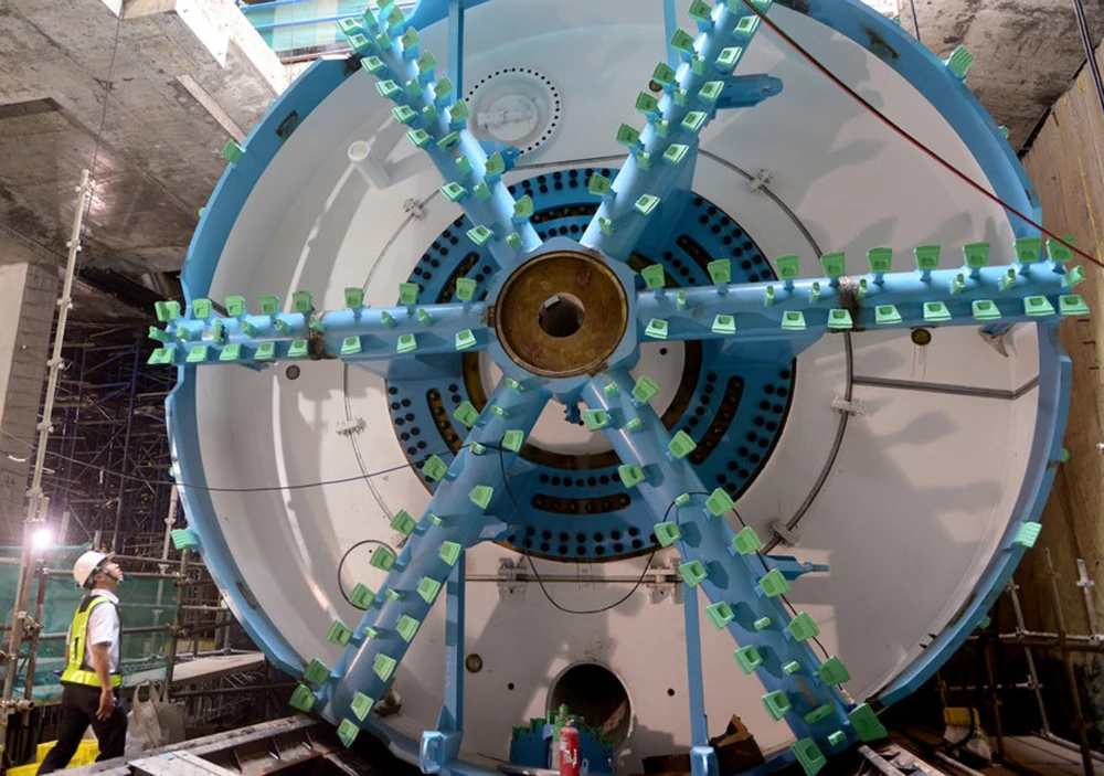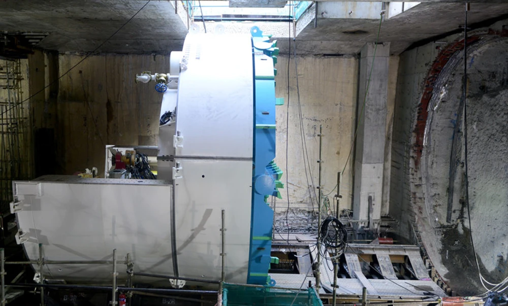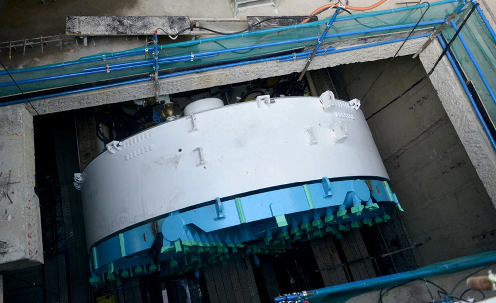 Mũi khoan có đường kính gần 6,79 m, dài 8,30 m được đưa xuống lòng đất an toàn và được định vị ở vị trí chuẩn bị thi công...