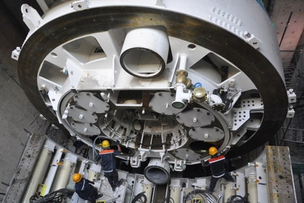 Những ngày qua, các bộ phận của máy khoan TBM được lần lượt đưa từ hố mở trên mặt đất, tại khu vực nhà ga Ba Son xuống dưới lòng đất ở độ sâu 17 m để lắp ráp lại...