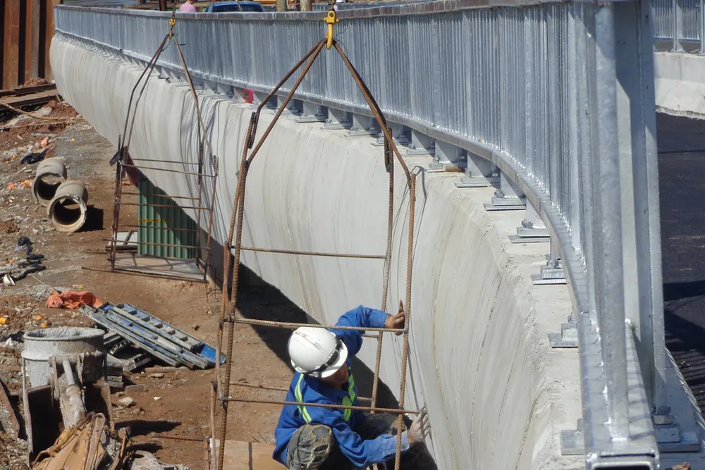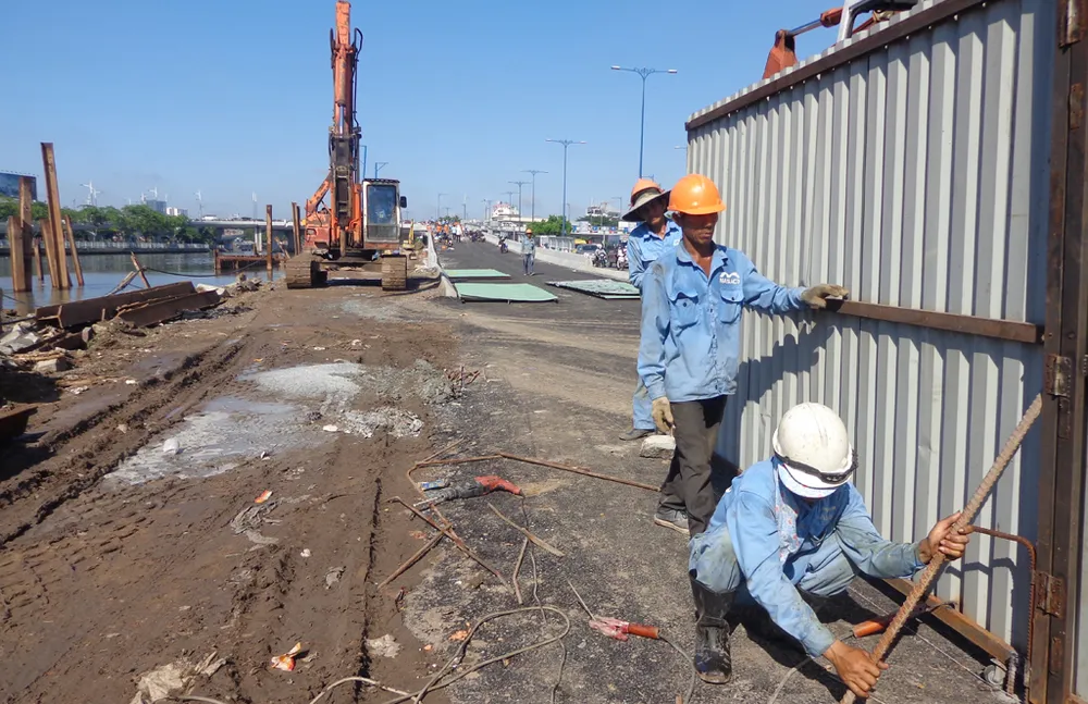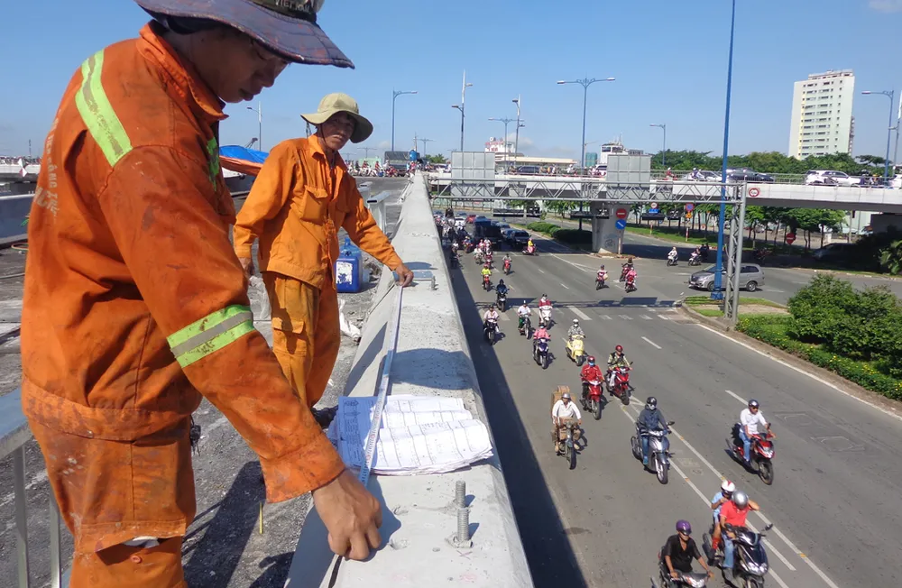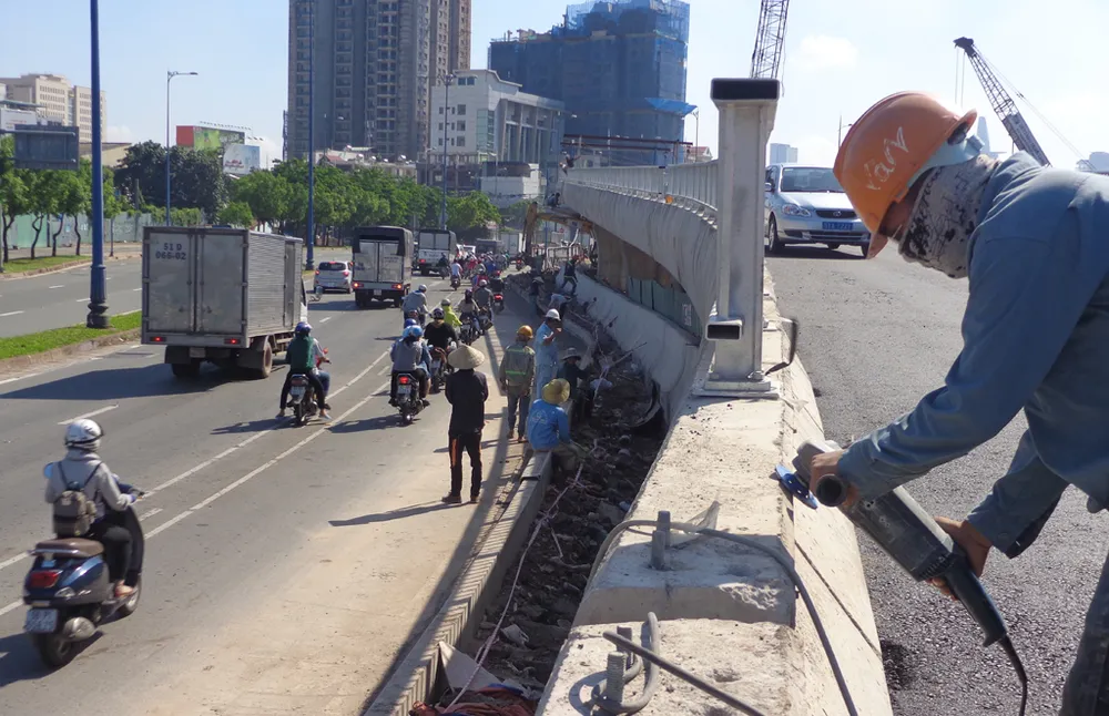 Công nhân tập trung mài nhẵn lại thành ngoài của nhánh cầu rẽ từ đại lộ Võ Văn Kiệt lên cầu Nguyễn Văn Cừ.