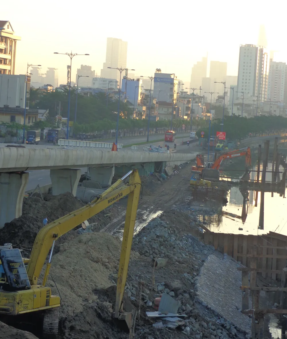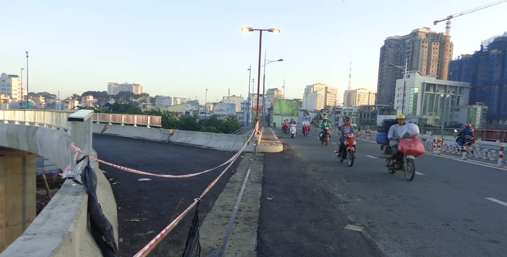 Ở phần chân đường hạ từ nhánh rẽ xuống nối vào đại lộ Võ Văn Kiệt hàng rào chắn công trình được tháo dỡ, di dời vào bên trong để lấy mặt đường cho xe lưu thông.