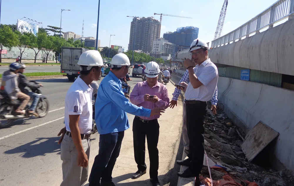 Trong sáng 27-6, chủ đầu tư đi kiểm tra từng hạng mục nhỏ của công trình. Ngay bồn trồng cây xanh, hoa, cỏ nằm giữa đại lộ Võ Văn Kiệt và chân tường chắn của nhánh rẽ lên cầu chính cũng được kiểm tra kỹ lưỡng.