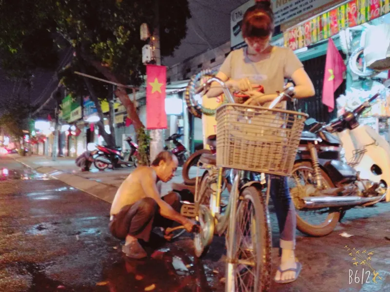 Đến 19h, về trên đường Nơ Trang Long (Bình Thạnh) mới có một tiệm sửa xe còn mở cửa. Tiệm khá cũ kĩ, người đàn ông già tóc đã điểm bạc, đang sửa xe. Để đảm bảo không bị chặt chém tôi cũng hỏi dò trước giá cả: