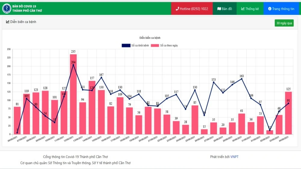 Biểu đồ số ca COVID-19 hàng ngày (cột màu đỏ) trong một tháng qua ở TP Cần Thơ. Ảnh: Cổng thông tin COVID-19 TP Cần Thơ.