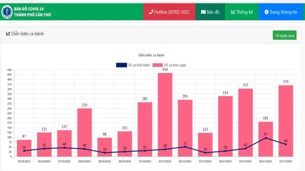 Ca nhiễm mỗi ngày tại Cần Thơ trong 14 ngày qua. Ảnh: Cổng thông tin COVID-19 Cần Thơ.
