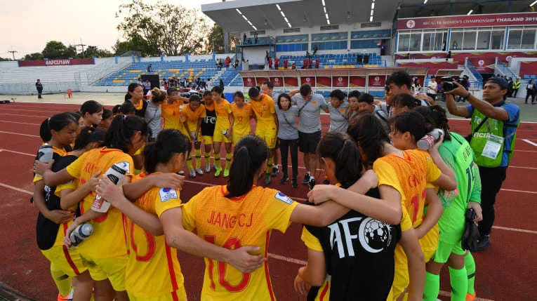 HLV Chan Yuen Ting và các học trò U-16 TQ. Ảnh: AFC