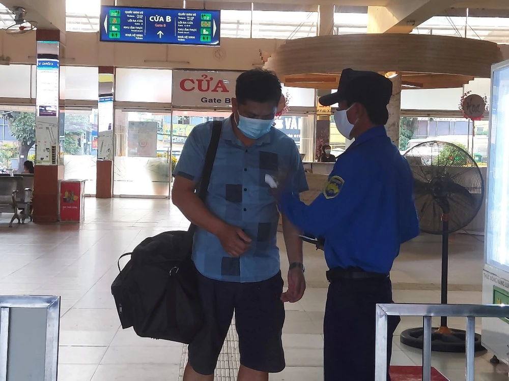 Hành khách được đo thân nhiệt trước khi ra bãi đỗ xe để lên xe.