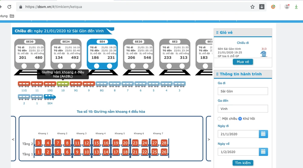 “Tôi cần mua vé khứ hồi từ Sài Gòn về Vinh và từ Vinh về Sài Gòn. Đi ngày 21-1 (là ngày 27-12 âm lịch), về lại Sài Gòn vào ngày 1-2, đi giường nằm điều hòa, tàu SE4. Biết thông tin nay là ngày đầu bán vé tàu tết nên phải mua ngay. Sáng tôi bận việc chưa mua được, với nghĩ nay mới là ngày đầu. Nhưng tới chiều tối nay, tôi vào trang dsvn.vn thì giường nằm đã hết chỗ” - chị Vân (Nghệ An) cho biết.
