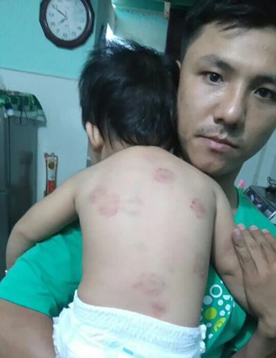 Vết cắn trên lưng bé Bích bầm tím khiến bé sốt nhiều ngày liền. (Ảnh do gia đình cung cấp)
