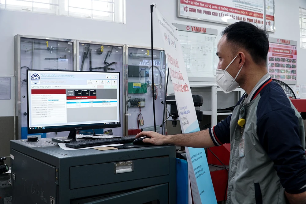 Tại một điểm đo kiểm nằm trên đường Xuân Thủy (quận Cầu Giấy), một máy đo khí thải được lắp đặt ở khu vực bảo dưỡng. Khách hàng đến bảo dưỡng, sửa xe sẽ được nhân viên thông báo chương trình đo kiểm khí thải miễn phí.