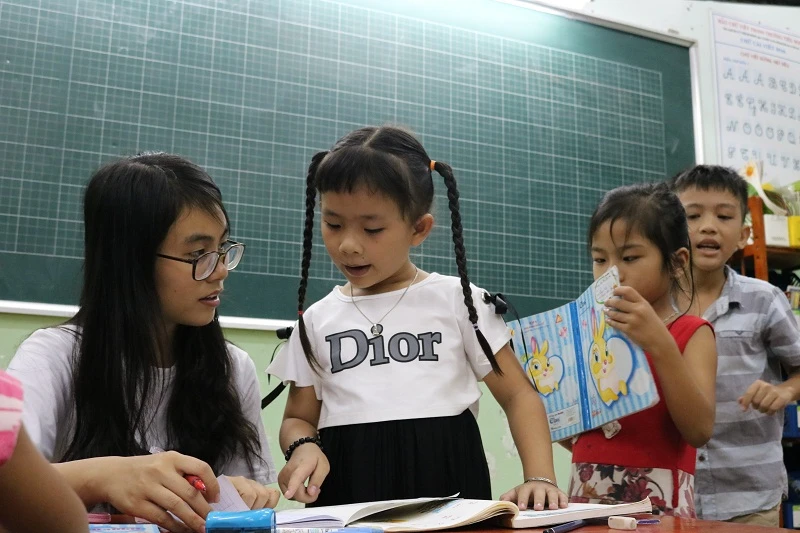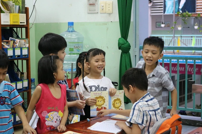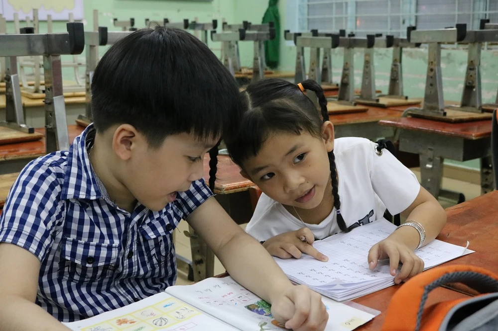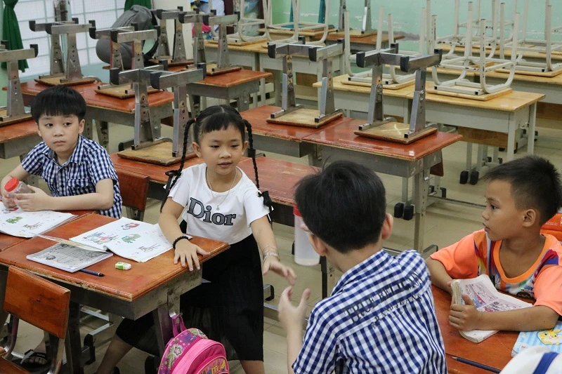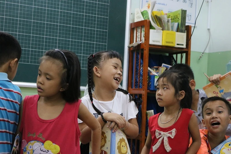 Mới học được hai buổi, nhưng Hân đã thân thiết với các bạn trong lớp của mình. Ảnh: THANH TUYỀN.