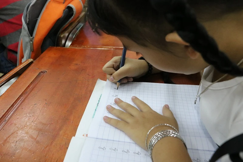 Đánh vần theo lời dạy của cô giáo. Ảnh: THANH TUYỀN.