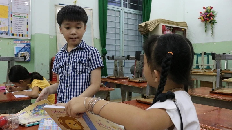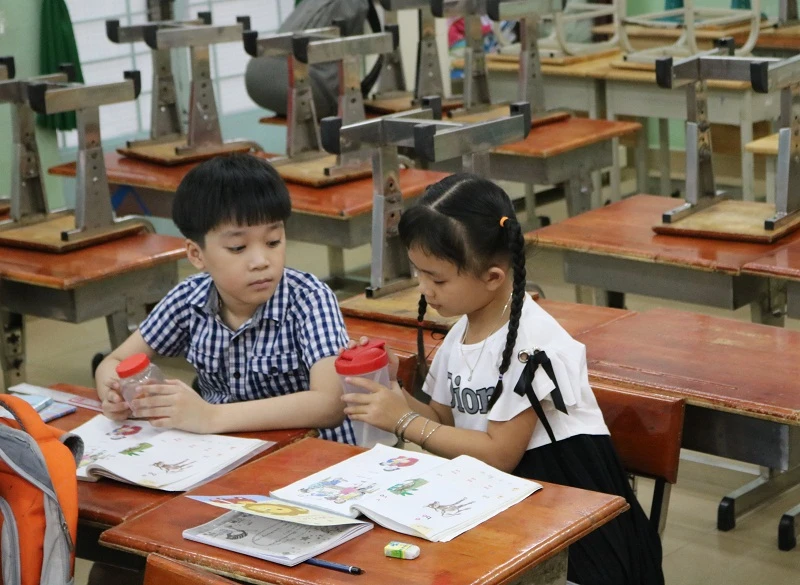 Hân với bạn cùng bàn trở nên thân thiết hơn, hay chỉ bài cho nhau và đưa nước cho nhau uống. Ảnh: THANH TUYỀN.