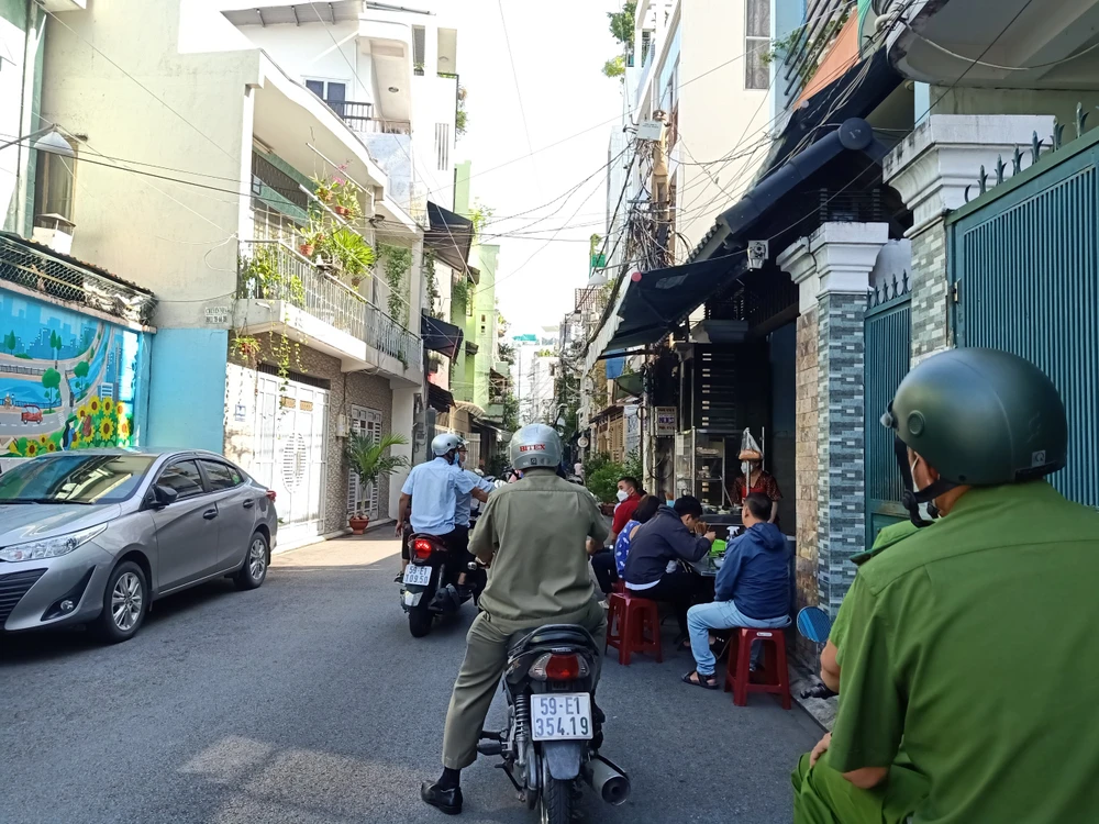 Tại Tân Bình, lực lượng chức năng cũng đi nhắc nhở các hàng quán trong ngày đầu tiên mở bán tại chỗ trở lại, để đảm bảo an toàn phòng dịch cũng như trật tự khu phố.