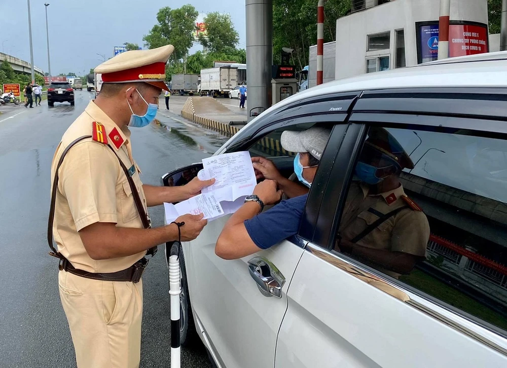 CSGT kiểm tra giấy xét nghiệm chốt kiểm soát quốc lộ 51 từ đường Cao tốc Dầu Giây- Long Thành- TP.HCM. Ảnh: VH