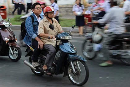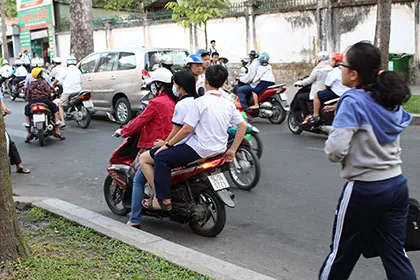 Nhiều phụ huynh vẫn vô tư đưa con đến trường mà không quan tâm tới việc sử dụng nón bảo hiểm cho con mình. Ảnh: ĐỨC NAM - HỮU NHẬT
