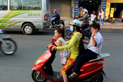 Sáng 10-4, rất nhiều trẻ em trên 6 tuổi không đội mũ bảo hiểm khi đi trên xe gắn máy. Ảnh Phước Tĩnh.