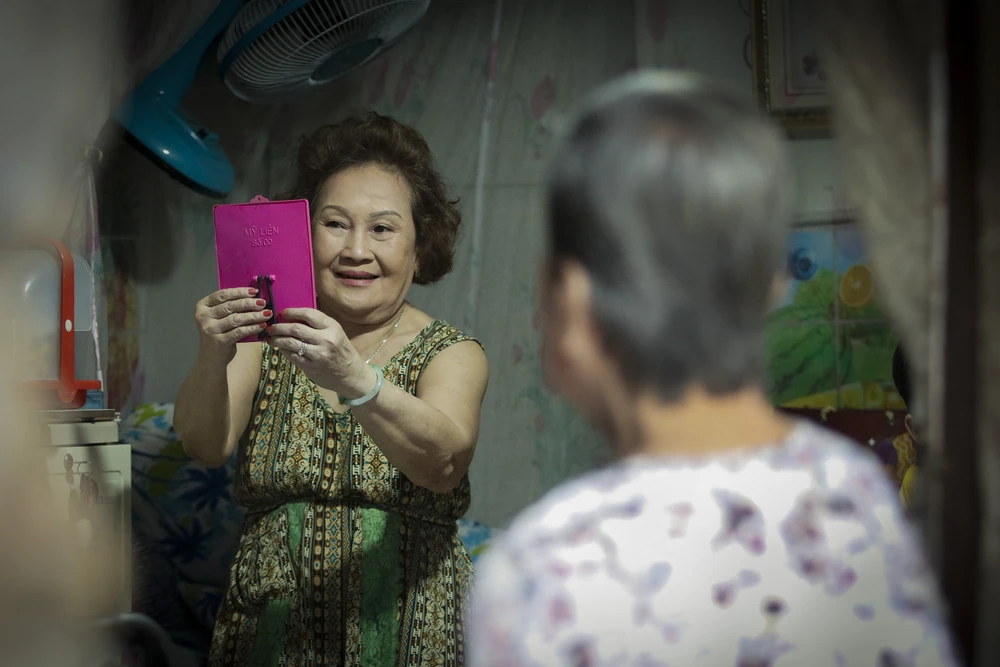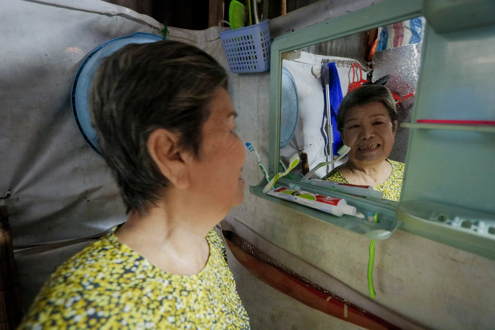 Bà Nguyễn Thị Kim Hoa (73 tuổi) thích thú ngắm mình trong gương. Hiện tại bà sống một mình, mưu sinh bằng việc nhặt ve chai. "Lâu lắm rồi mới có cảm giác vui đến vậy" - Bà Hoa tâm sự.