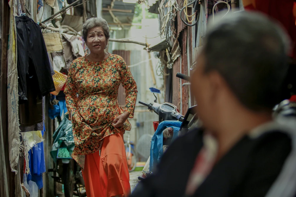 Bà Hoa được người hàng xóm thay giúp thay áo, bà bị tai biến đi lại rất bất tiện.