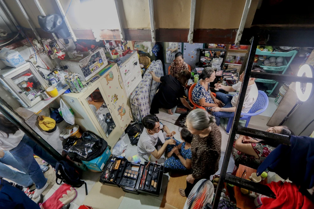 Phòng trọ chưa đầy 25m2 của bà Trần Thị Lệ hôm nay trở nên rôm rả vì được đón nhiều lượt khách, đó là những người hàng xóm của bà. Trong số họ, có người ngồi đợi trang điểm, người ngồi đợi tô lại son môi vì lỡ ăn sáng làm phai mất,…