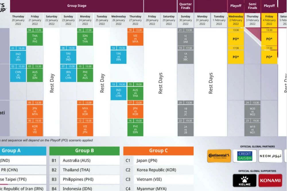 Lịch đấu ba bảng tại Asian Cup 2022 (Bảng A: màu xanh da trời, Bảng B: xanh lá cây và Bảng C: Cam).