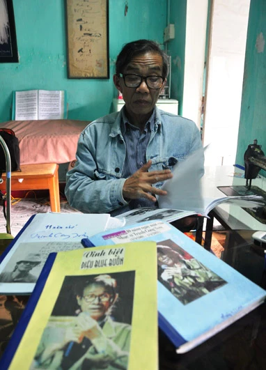 Vừa bước vào nhà, đập ngay vào mắt chúng tôi là bức chân dung Trịnh Công Sơn khổ lớn treo ở phòng khách. Hai bức ảnh của Trịnh chụp với Khánh Ly, Dao Ánh được treo bên cạnh. Trong chiếc tủ kính ở một góc tường, ông trưng bày đầy đủ các loại sách vở, tranh ảnh, đĩa nhạc liên quan đến Trịnh Công Sơn. Tất cả được trân trọng, gìn giữ như một góc kỷ niệm quý giá của gia đình mình. Chính ông cũng thừa nhận: “Tôi là một tín đồ đắm say, chung thủy với Trịnh Công Sơn. Đến chữ viết tôi cũng thích viết theo kiểu chữ phăng của ông”.