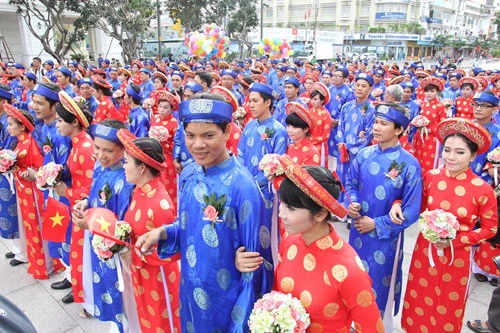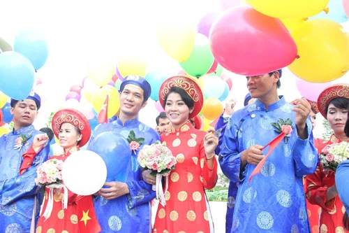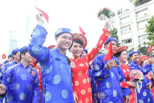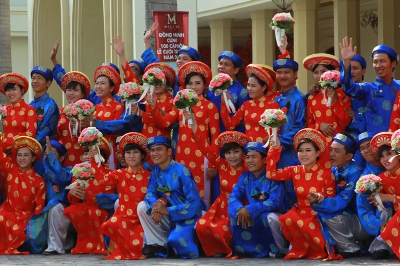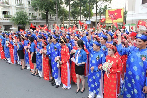 100 cặp đôi chụp ảnh lưu niệm thời khắc hạnh phúc tại Trung tâm tiệc cưới hội nghị Melisa (quận Phú Nhuận, TP.HCM) - Ảnh: Phước Tĩnh