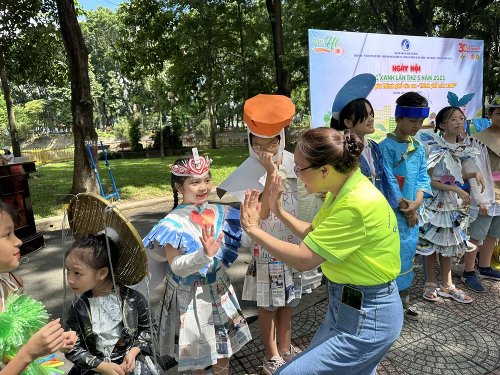Các em thiếu nhi giao lưu với ban tổ chức tại Ngày hội sống xanh. Ảnh: Quận Tân Bình |
