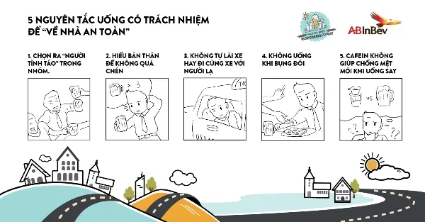 Trong sự kiện này, toàn bộ nhân viên AB InBev sẽ ra quân thực hiện chương trình tại các siêu thị, điểm bán lẻ và nhà hàng ở Hà Nội, TP.HCM và Bình Dương. Các hoạt động này nhằm khuyến khích người tiêu dùng nâng cao ý thức uống có trách nhiệm bằng việc truyền tải những thông tin phong phú, thiết thực trên tờ rơi về năm nguyên tắc uống có trách nhiệm để “về nhà an toàn” khi tham gia giao thông.