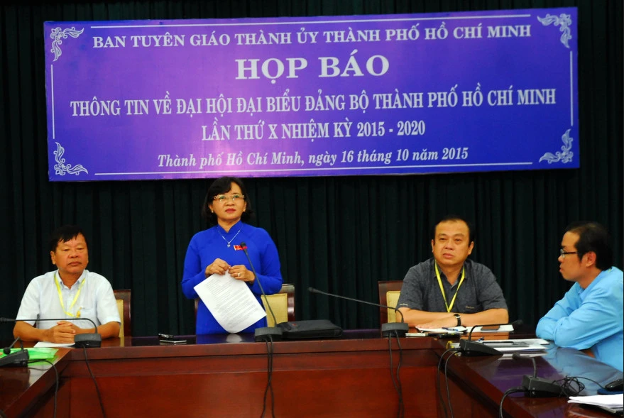 Chiều 16-10, bà Thân Thị Thư, Trưởng ban Tuyên giáo Thành ủy TP.HCM, đã chủ trì cuộc họp báo để thông tin về kết quả ngày làm việc thứ ba Đại hội đại biểu Đảng bộ TP.HCM khóa X nhiệm kỳ 2015-2020, trong đó có nội dung bầu cử nhân sự.