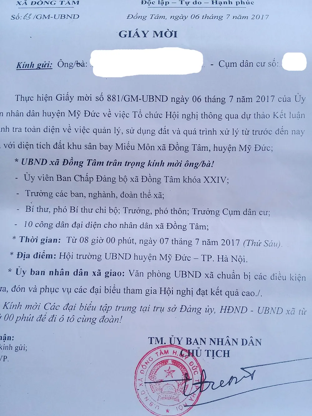 Nội dung giấy mời của xã mời các thành viên là Uỷ viên BCH Đảng bộ xã Đồng Tâm, trưởng các ban ngành đoàn thể của xã, Bí thư, phó bí thư chi bộ, trưởng phó thôn, trưởng cụm dân cư và 10 người đại diện cho nhân dân xã Đồng Tâm.