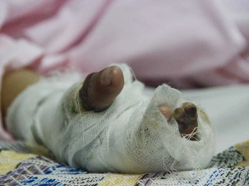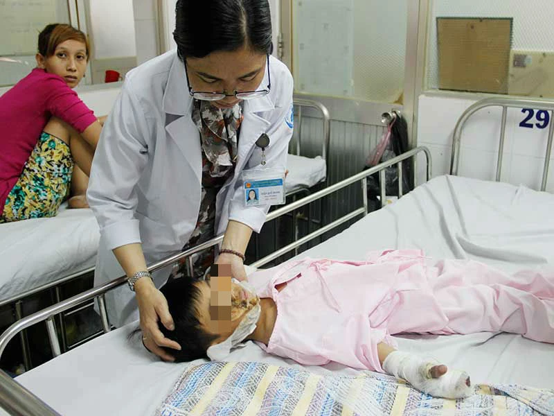ThS-BS Diệp Quế Trinh, khoa Phỏng-Tạo hình BV Nhi đồng 1, cho biết bé Phước nhập viện trong tình trạng bỏng nặng vùng mặt phải và hai tay, cấp độ 3, 4. Vết thương cháy sâu đến gân và xương. Nhiều chỗ có dấu hiệu bị nhiễm trùng, sốc nặng. Khi vừa vào bệnh viện, bé đã được các bác sĩ truyền nước, kháng sinh, lọc da hoại tử và xử lý nhiễm trùng.