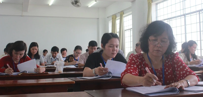 Giáo viên chấm thi THPT năm 2016 tại Trường ĐH Công nghiệp Thực phẩm TP.HCM. Ảnh: AN NHIÊN